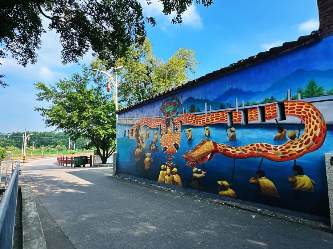 在畫筆起落、線條勾勒、顏料涂抹間,惠農(nóng)政策、燈會活動、喜慶醒獅、金黃稻田、古樸農(nóng)舍、美麗庭院以及紅線女粵劇文化等泮村特色文化元素躍然白墻黛瓦,既展現(xiàn)了黨建引領(lǐng)作用的生動場景,又彰顯泮村村在推進“百千萬工程”和鄉(xiāng)村振興上的豐碩成果。