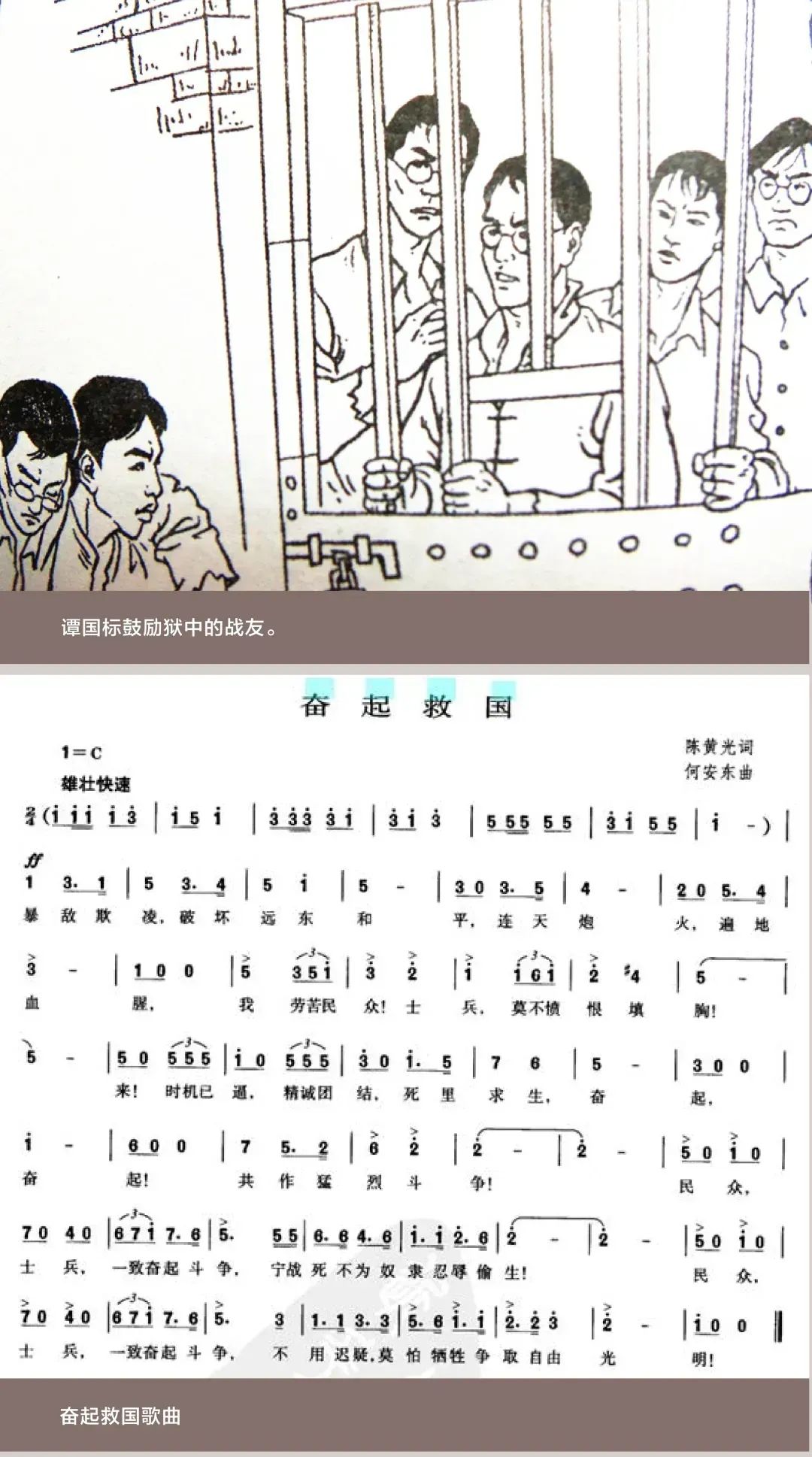 雖身陷囹圄,譚國標(biāo)仍然斗志昂揚(yáng)。在獄中,譚國標(biāo)對朋友說:“革命總是有犧牲的,你出獄后繼續(xù)斗爭的任務(wù)更艱巨。”此外,譚國標(biāo)向看守人員做思想工作,并利用葉傲霜探視的機(jī)會,把寫著《奮起救國》和《萬里尋兄》(電影《野草閑花》主題曲)歌詞和詩句的紙條,傳遞給女牢的戰(zhàn)友,以此鼓勵不要放棄,堅(jiān)持斗爭。