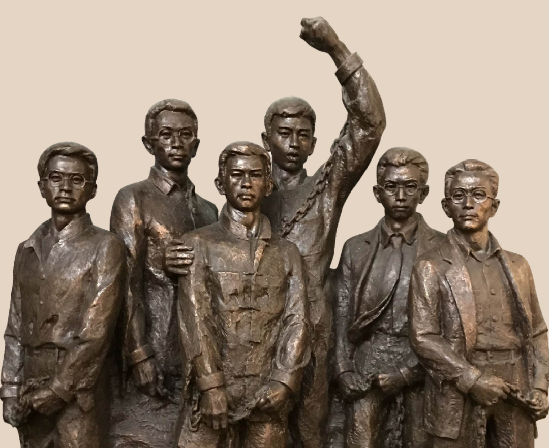 1934年8月1日,譚國標(biāo)、溫盛剛、凌伯驥、賴寅倣、鄭挺秀、何仁棠被逐個(gè)叫出監(jiān)獄。他們知道為革命赴義的時(shí)候到了,他們手挽著手,唱著國際歌,來到紅花崗齊聲高呼:“打倒日本帝國主義!打倒國民黨反動派!中國共產(chǎn)黨萬歲!”說罷,慷慨就義,血染紅花。