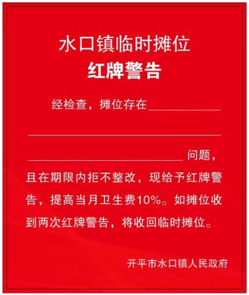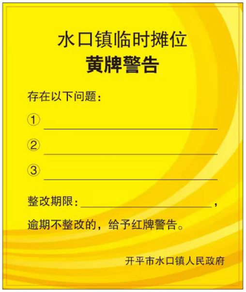 “紅黃牌”警示制度是指水口鎮(zhèn)執(zhí)法辦加強(qiáng)對(duì)臨時(shí)攤區(qū)(點(diǎn))市容環(huán)境衛(wèi)生管理情況的監(jiān)督考核,定期組織檢查,依法對(duì)不服從管理、違反市容和環(huán)境衛(wèi)生管理要求的臨時(shí)攤檔實(shí)行黃牌或紅牌警告。