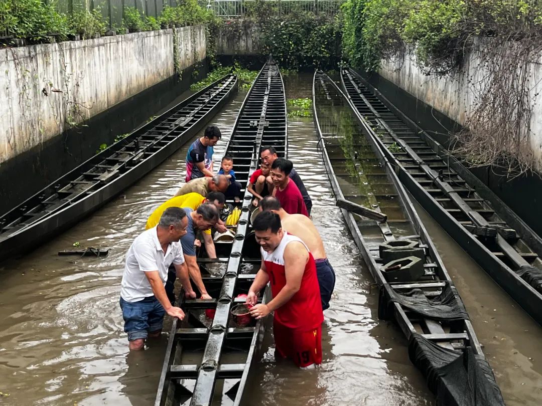 村民們趁著退潮,清理水生植物,舀干水,清理淤泥,再用稻草等把船身里外洗擦干凈,其后還要進(jìn)行一系列的如補(bǔ)灰,打磨、上漆、調(diào)龍根等維修工序,龍舟才能正式使用。