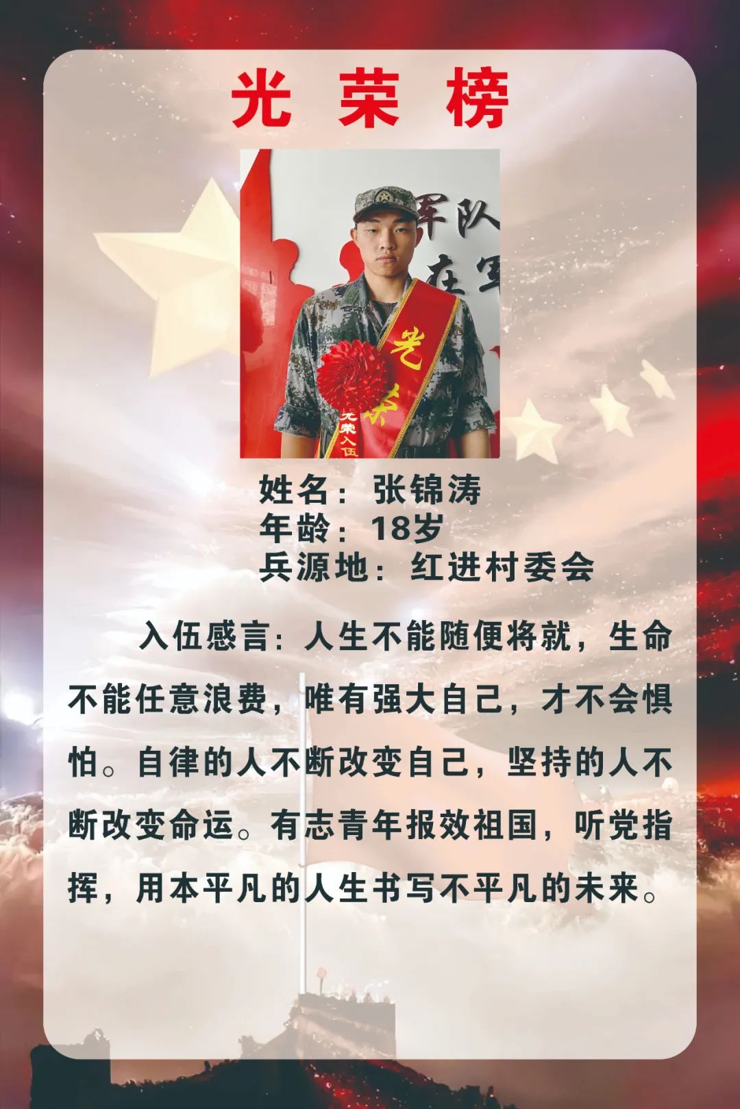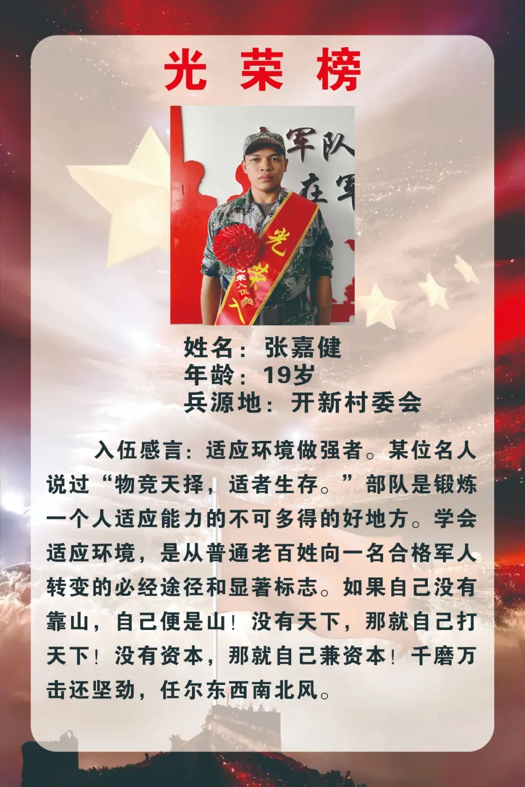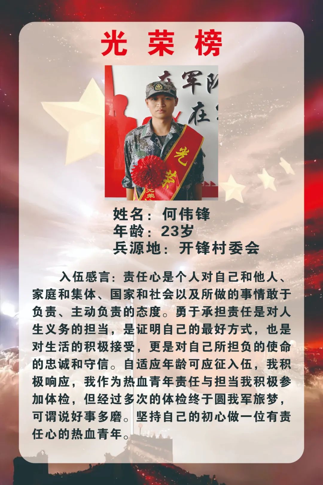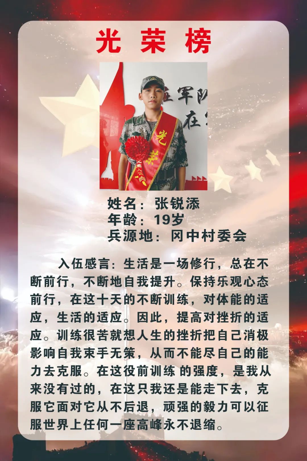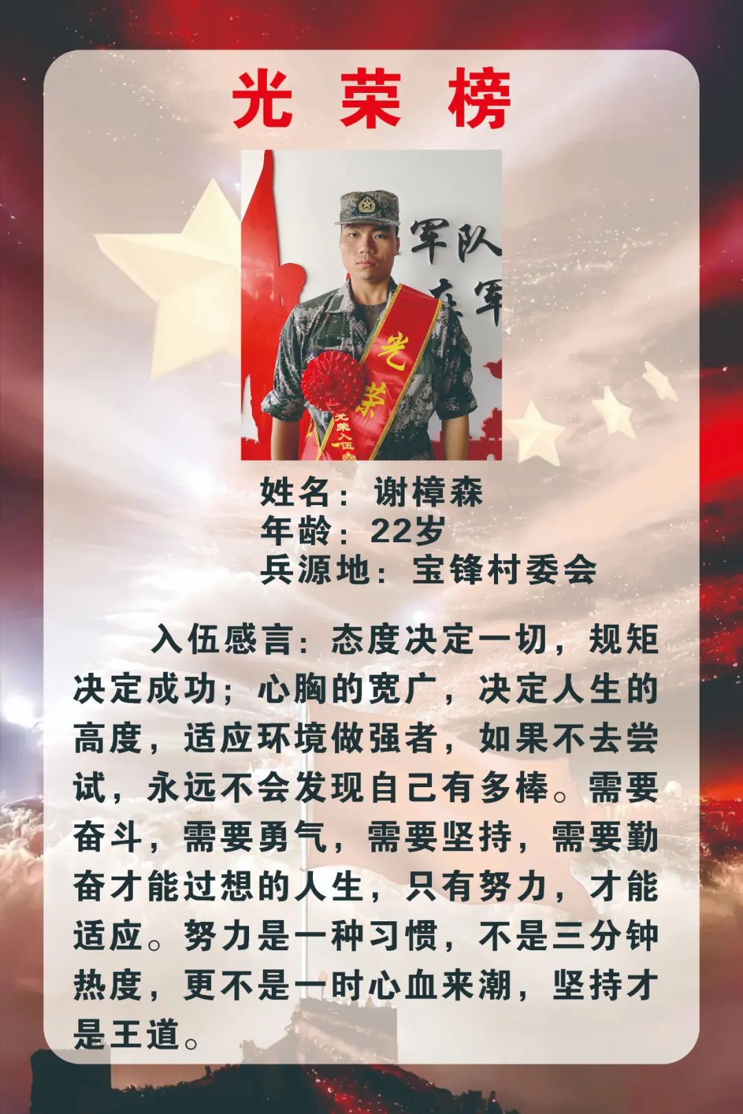 新兵們紛紛表達(dá)了投身火熱軍營的熱情和衛(wèi)國戍邊的決心,表示將不負(fù)國家和家鄉(xiāng)人民的期望和囑托,主動(dòng)融入,安心服役,盡快適應(yīng)部隊(duì)生活節(jié)奏,刻苦訓(xùn)練、努力學(xué)習(xí),做一名聽黨指揮、能打勝仗、作風(fēng)優(yōu)良的新時(shí)代軍人,為國防事業(yè)作出應(yīng)有貢獻(xiàn),給家鄉(xiāng)人民交上一份滿意的答卷。