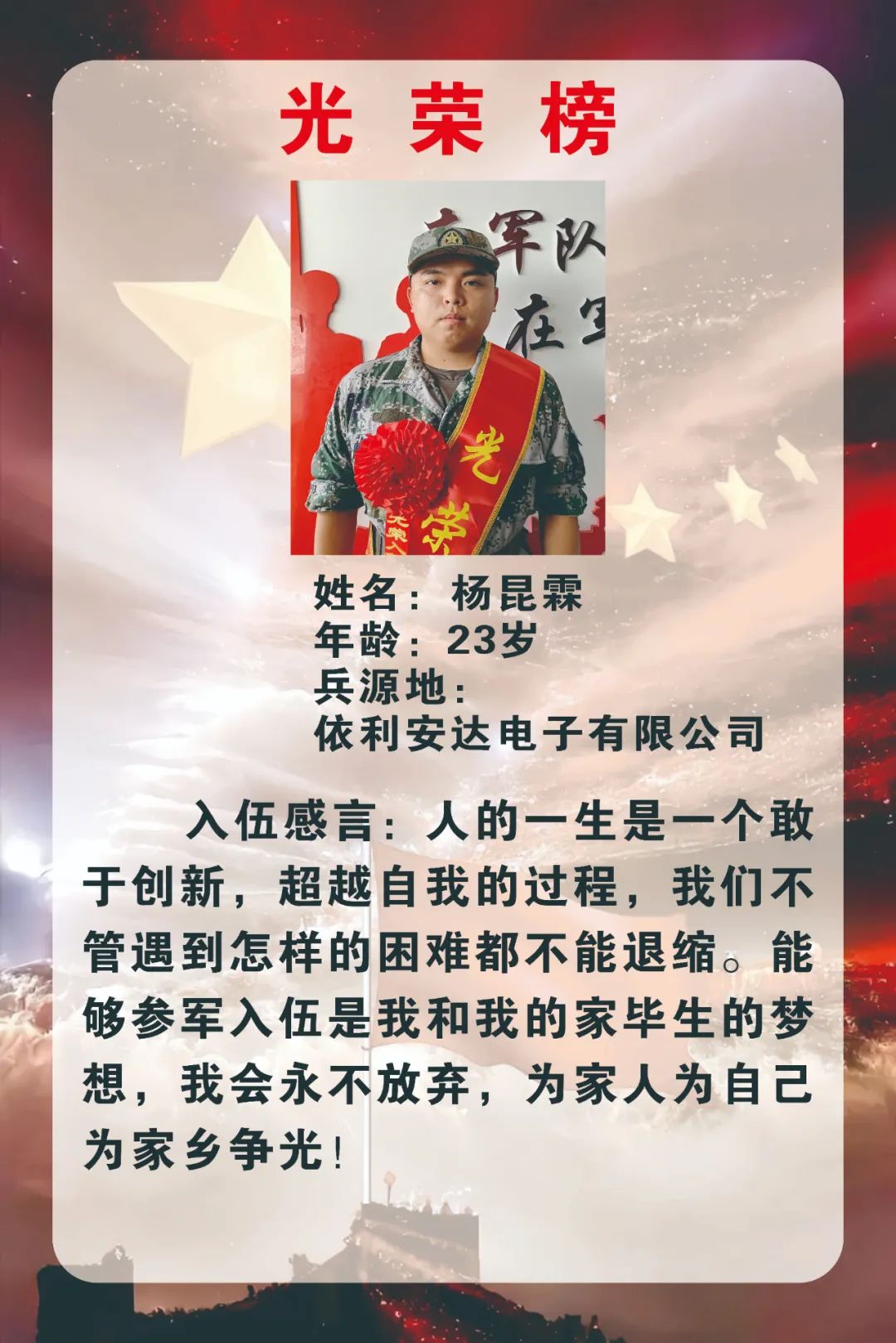 在此輪征兵工作中,開平依利安達(dá)電子有限公司廣泛動(dòng)員滿足條件的青年員工踴躍報(bào)名參軍。經(jīng)過層層篩選,最終2名大學(xué)生員工懷揣滿腔熱血與豪情奔赴軍營,踏上保家衛(wèi)國新征程。