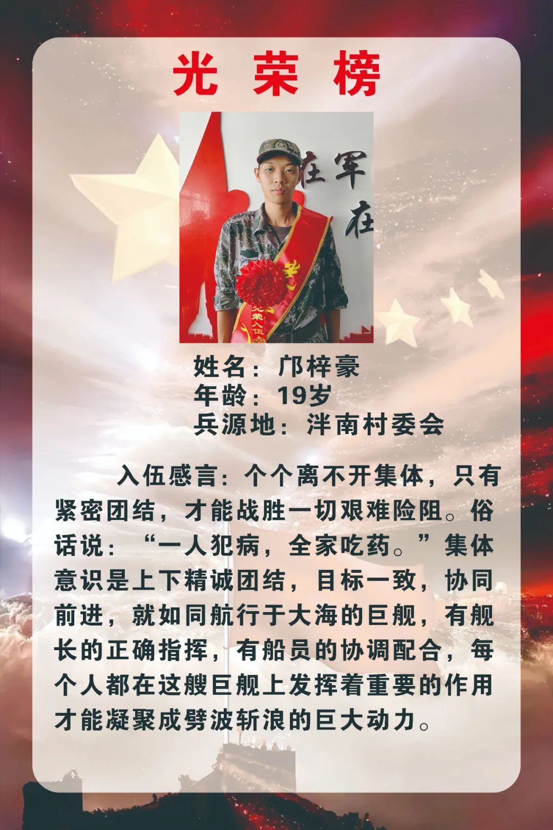 會(huì)上,胡萬程代表鎮(zhèn)黨委、政府向入伍新兵表示熱烈祝賀,勉勵(lì)新兵們要堅(jiān)守信仰初心,鑄牢忠誠之魂,將個(gè)人理想轉(zhuǎn)化為獻(xiàn)身國防事業(yè)的強(qiáng)大動(dòng)力,爭(zhēng)做一名有靈魂、有本事、有血性、有品德的新時(shí)代軍人用自己的實(shí)際行動(dòng)為家鄉(xiāng)人民添彩、為強(qiáng)軍事業(yè)建功。
