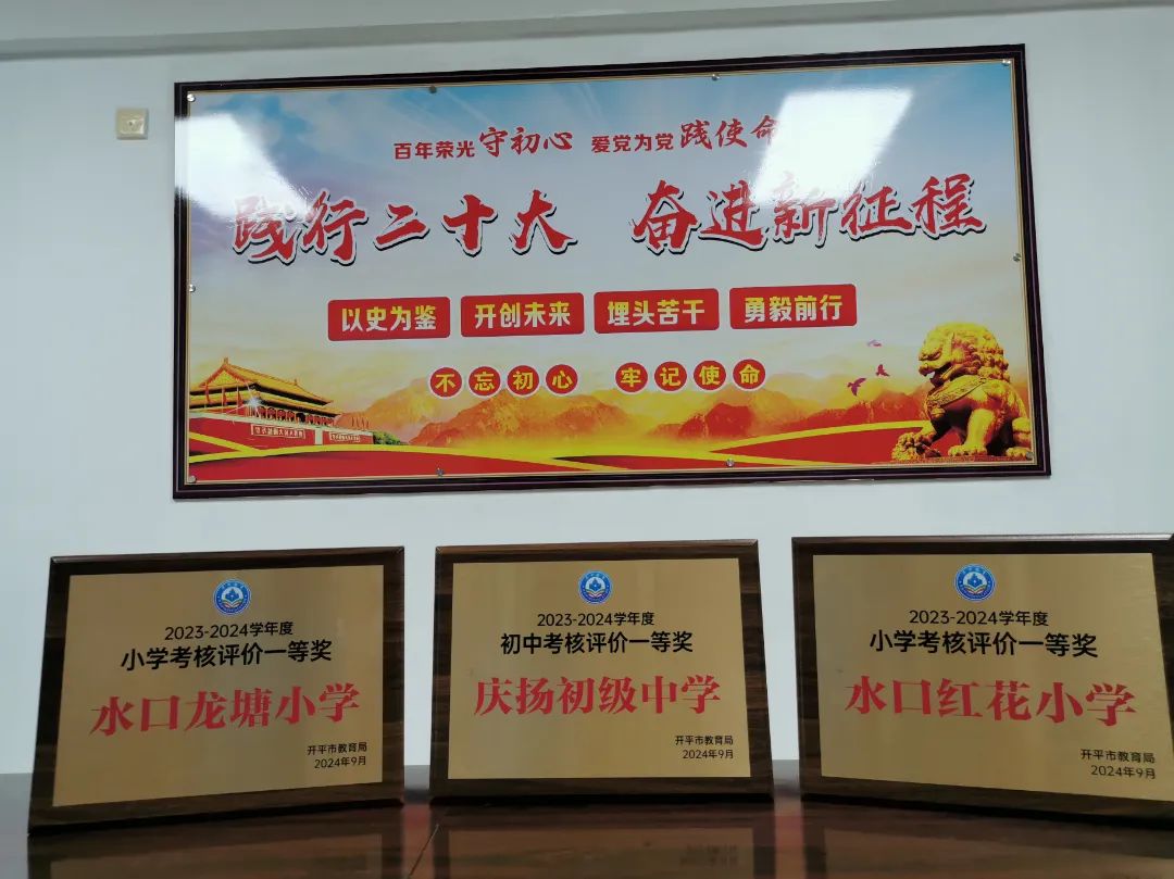 金秋送爽,丹桂飄香。在這個充滿收獲與希望的季節(jié)里,水口鎮(zhèn)中心學(xué)校轄區(qū)內(nèi)中小學(xué)傳來振奮人心的喜訊。在2023—2024 學(xué)年開平市義務(wù)教育階段考核評價這場激烈的角逐中,慶揚初級中學(xué)榮獲初中組一等獎;龍?zhí)列W(xué)、紅花小學(xué)榮獲小學(xué)組一等獎。