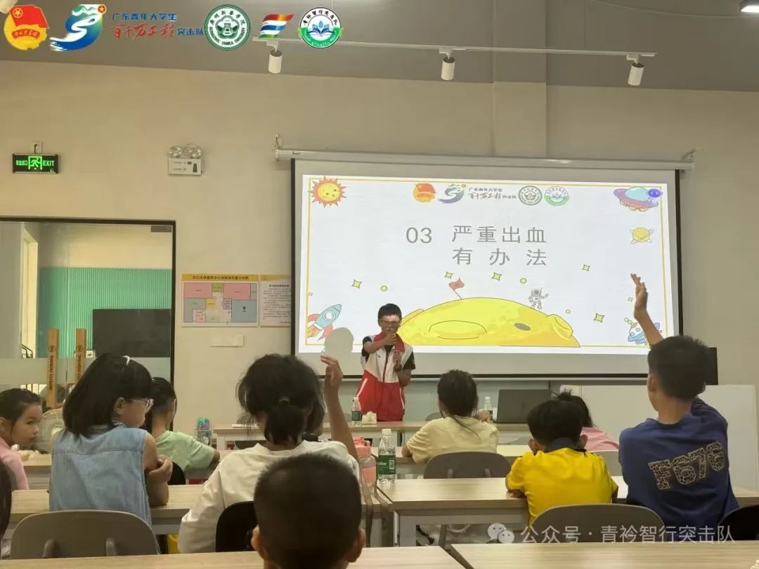 在常見傷口處理和中暑應(yīng)對課堂上,隊員們?yōu)樵趫鰧W員講解了實用的處理方法。在傷口處理方面,授課隊員強調(diào)先清潔雙手,用生理鹽水沖洗、剔除異物,淺傷口涂碘伏消毒,深傷口或出血多者需按壓止血并及時就醫(yī),中暑處理則提到要迅速轉(zhuǎn)移患者至陰涼處,解開衣物、物理降溫,補充含鹽飲品,重癥情況需立即送醫(yī),還提醒孩子們在高溫天注意防曬補水,不要在炎熱的天氣進行長時間的戶外活動。