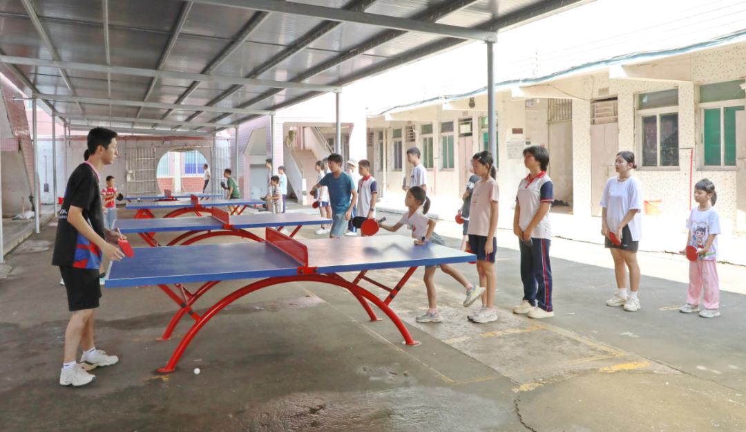 開平市沙岡初級中學鄉村學校少年宮乒乓球班教師陳英豪:“這次課程主要乒乓球基礎教學,如正手攻球、反手撥球、平擊發球等基礎動作的教學。在課程中我最大的感受是,學生眼中都透露著對乒乓球的熱愛。教學氛圍和學習氛圍都很好。一方面讓孩子們在暑期能有鍛煉的機會,另一方面讓孩子們在學習中結交新朋友的同時,減少對電子設備的依賴,保護眼睛。”
