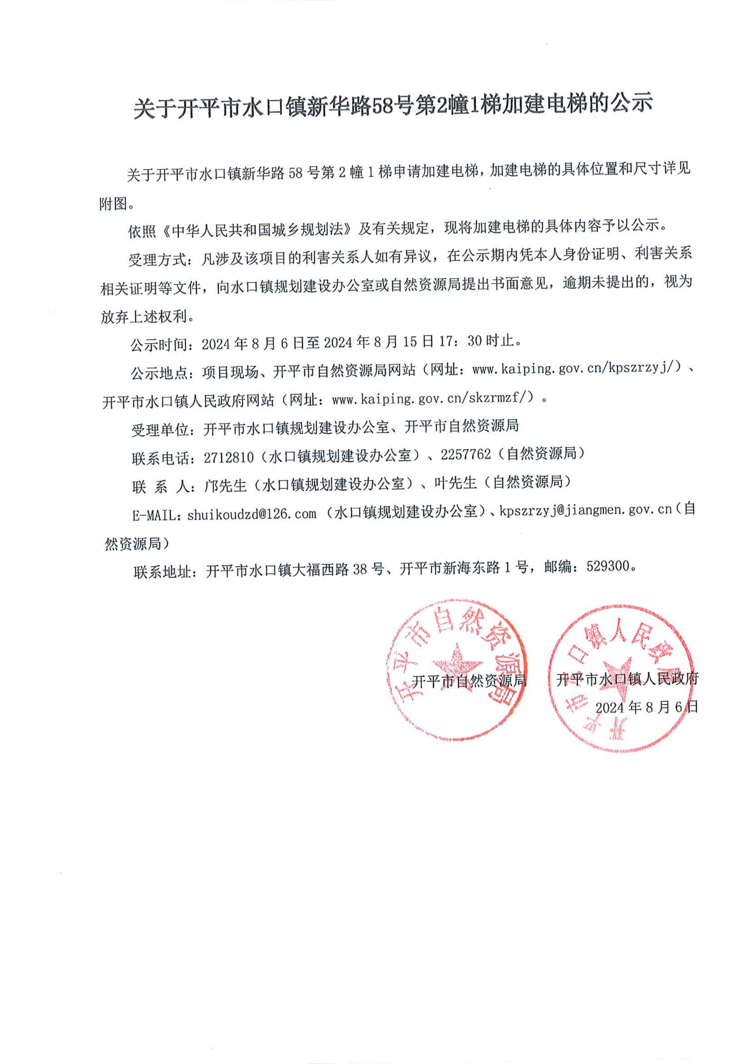 受理單位:開平市水口鎮規劃建設辦公室、開平市自然資源局
