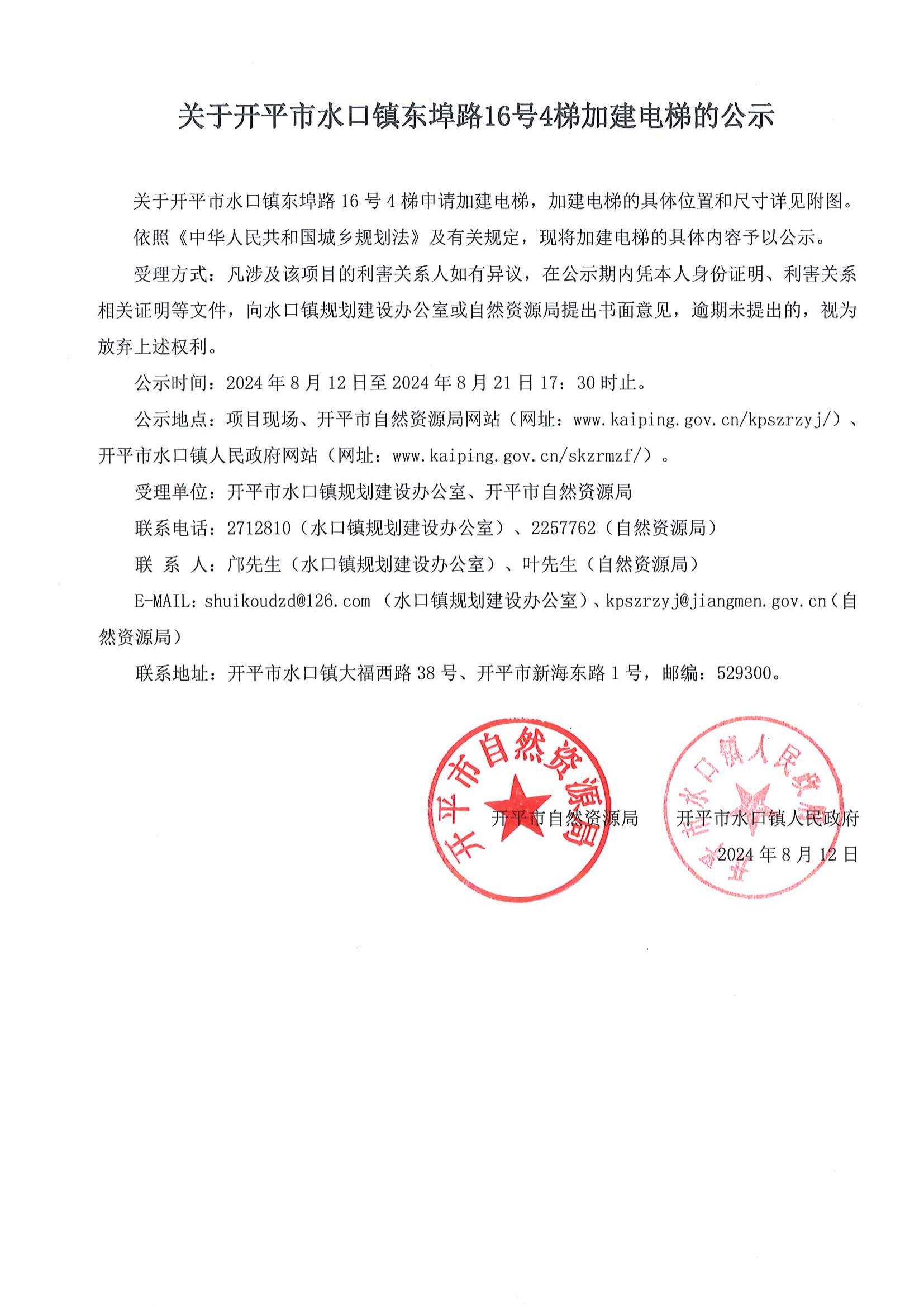 關于開平市水口鎮東埠路16號4梯申請加建電梯,加建電梯的具體位置和尺寸詳見附圖。依照《中華人民共和國城鄉規劃法》及有關規定,現將加建電梯的具體內容予以公示。受理方式:凡涉及該項目的利害關系人如有異議,在公示期內憑本人身份證明、利害關系相關證明等文件,向水口鎮規劃建設辦公室或自然資源局提出書面意見,逾期未提出的,視為放棄上述權利。