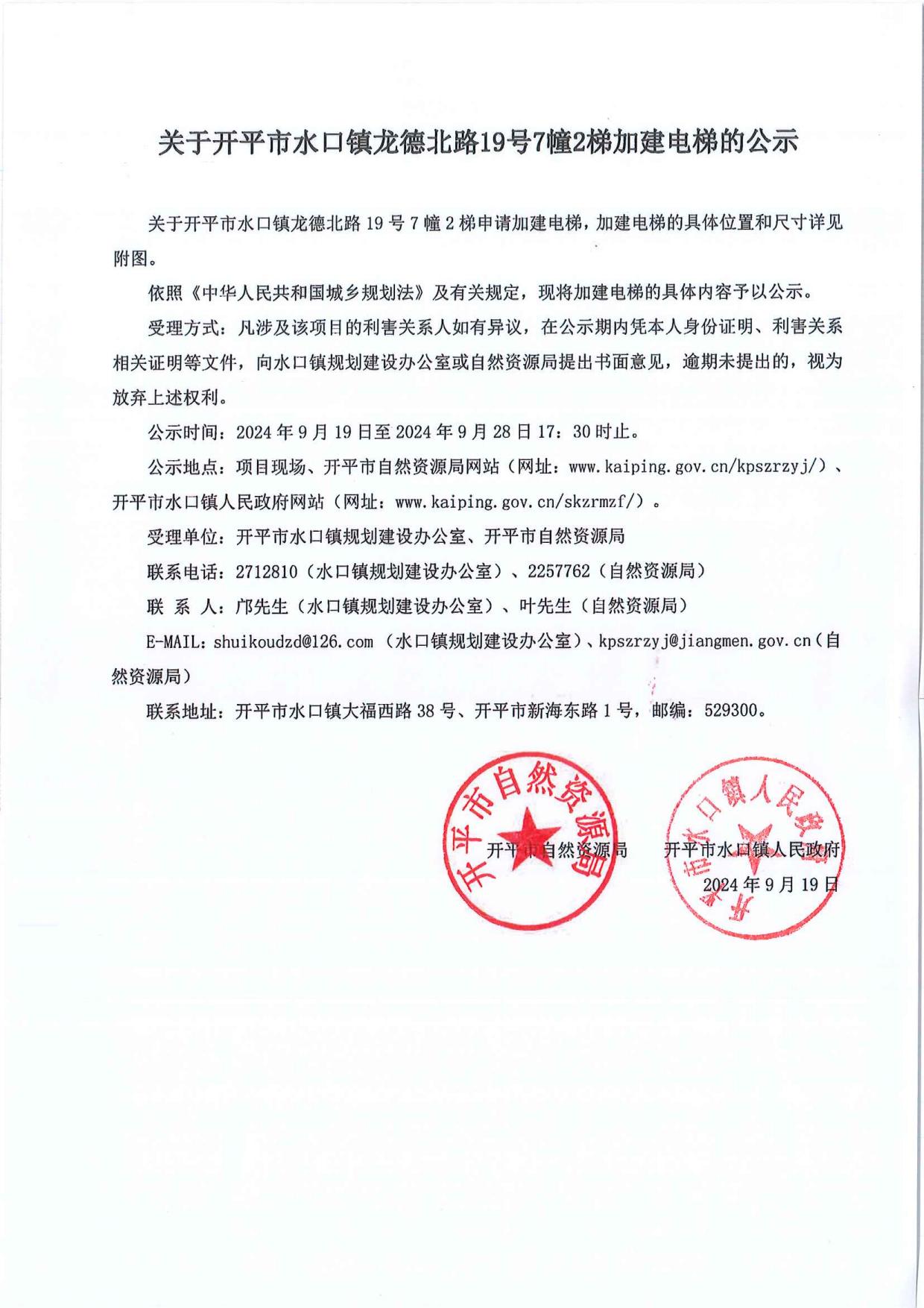 關(guān)于開(kāi)平市水口鎮(zhèn)龍德北路19號(hào)7幢2梯加建電梯的公示