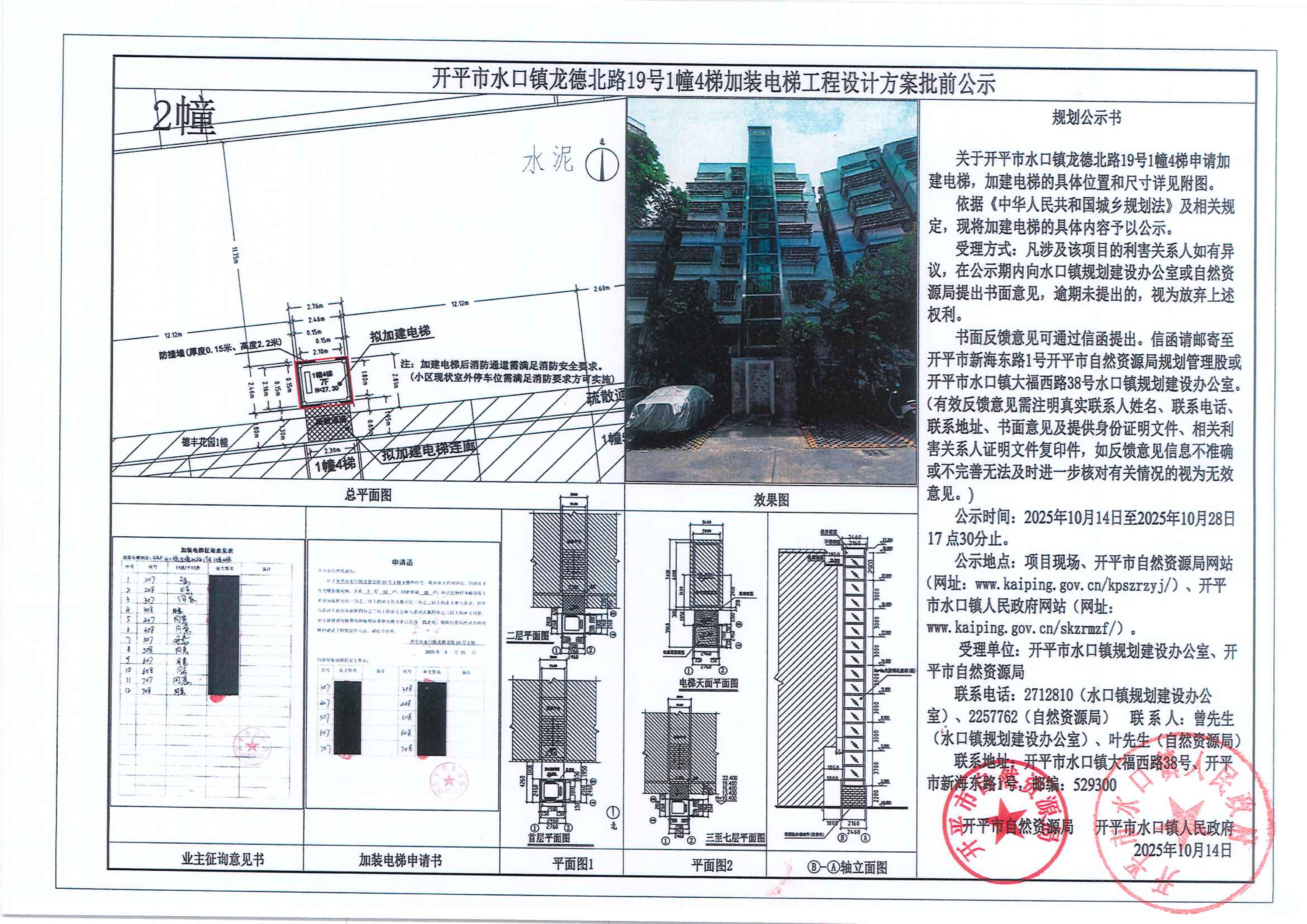 關(guān)于開平市水口鎮(zhèn)龍德北路19號1幢4梯申請加建電梯,加建電梯的具體位置和尺寸詳見附圖。