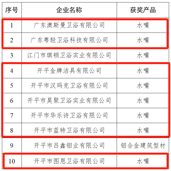 近日,經開平市人民政府審批同意,確定廣東澳斯曼衛浴有限公司等10家企業為2023年開平市工業產品質量優秀獎獲獎企業,其中,水口鎮8家優秀企業入圍,具體獲獎名單如下: