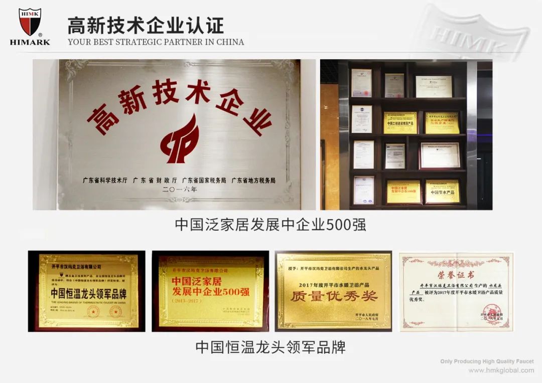 漢瑪克堅持以一流的技術、一流的設計、一流的工藝鑄就一流的產品、創造一流的品牌,取信于廣大客戶,產品暢銷全球40多個國家,先后榮獲“中國泛家居發展中企業500強”“中國恒溫龍頭領軍品牌”“中國十大五金龍頭品牌”中國節水產品”“中國工程建設推薦產品”等榮譽稱號。