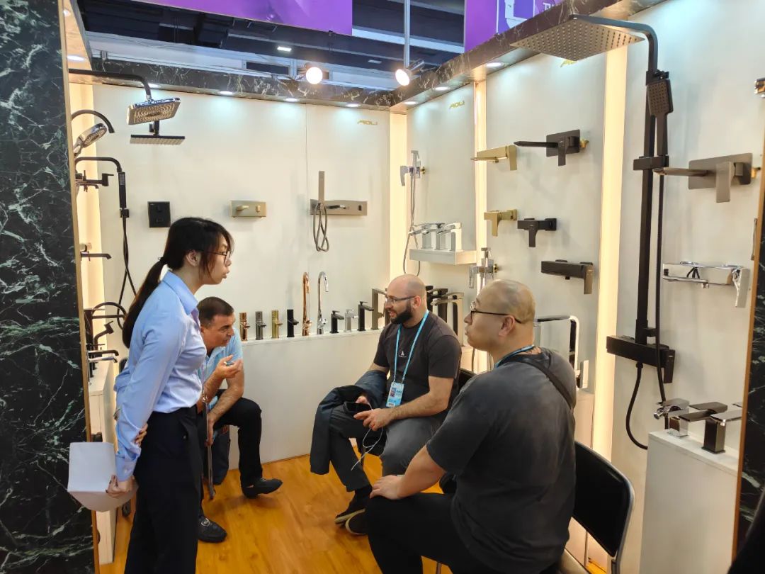 首次獲得品牌展位的廣東頂尖管業科技有限公司,攜眾多新品強勢來襲,其中榮獲2023年德國紅點設計獎的斐然多功能角閥套裝由多功能角閥、多功能噴槍和高壓防爆電話線管三部分組成,且三個部分均進行了創新設計并獲得專利。產品實現角閥和噴槍的兩種控制體系。同時將噴槍的開關模塊和出水模塊完美融合,以創新的開關方案,帶來產品與用戶的全新互動方式。經相關負責人介紹,該系列產品深受東南亞及中東地區客戶歡迎,目前約有15家采購商預約來公司參觀洽談。