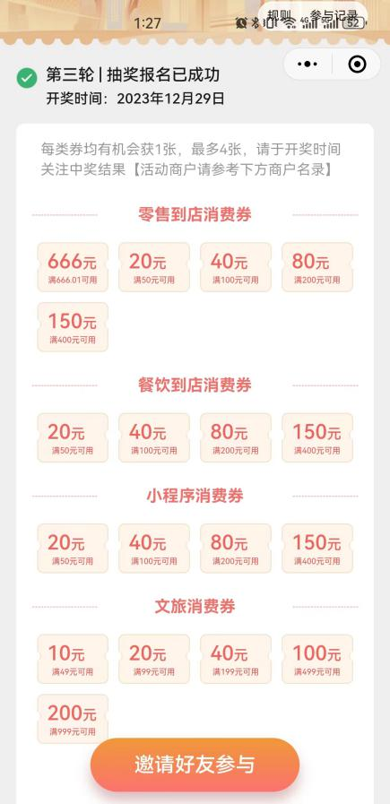 *12月29日7:00—9:00起陸續開獎,公眾可在“廣東消費券”微信小程序查詢中簽結果。