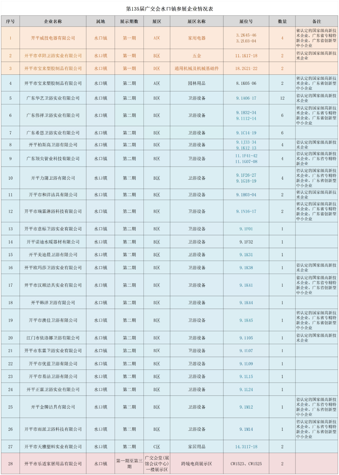 在本次廣交會一期(4月15日至19日),廣東華藝衛浴實業有限公司、廣東頂尖管業科技有限公司、開平市漢順潔具實業有限公司、開平市卓陽衛浴實業有限公司、開平市瑞霖淋浴科技有限公司、開平市樂適家居用品有限公司和開平市雷井水暖技術開發有限公司等7家水口本地企業作為開平市優秀企業代表,亮相中平臺綜合展示區“江門制造”展示館。